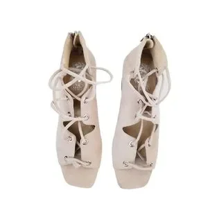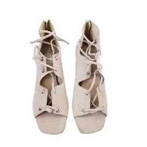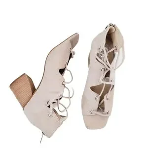 dramatic, geometrically cut topline is laced through with skinny straps reminiscent of a corset, giving this square-toe cage sandal a significant sassy vibe. True to size. - 3" heel (size 7.5) - Leather upper/synthetic lining and sole