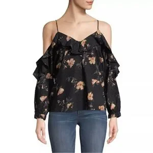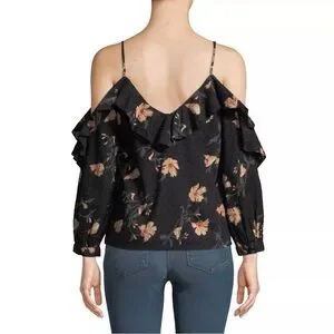 - Elegant black floral cold shoulder top with ruffle details. Perfect for a chic and stylish look.