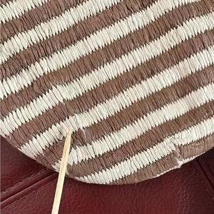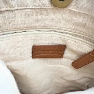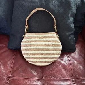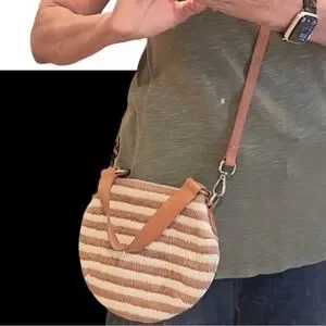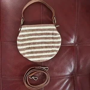 Soludos brown and tan raffia ISLA Crossbody Bag. Shaped like a canteen. Brass look findings. Straps appear leather, attached strap is 12 inches, the detachable strap and fasteners is 48.5 inches. Bag length is 8 inches, width is 9 1/2 inches across. Snap closure, Zippered pocket inside. Pretty raffia cotton construction with tiny space on the back, see photo. Pre-owned in great condition.