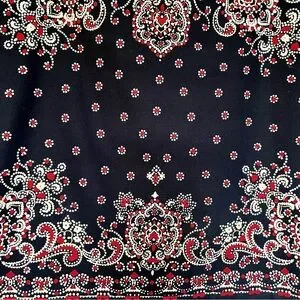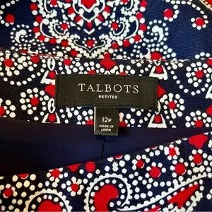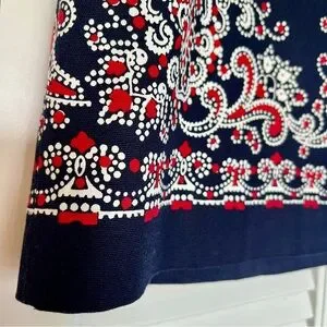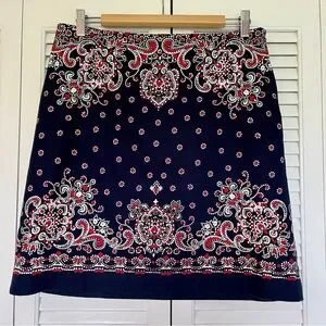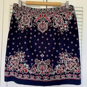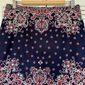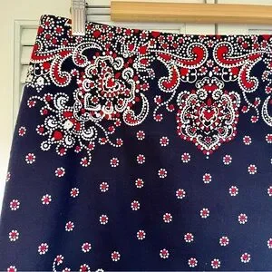 This elegant skirt features a striking navy blue base with intricate red and white paisley patterns. Perfect for adding a touch of sophistication to any outfit. Can be dressed up or down, depending on styling. Zips up side. Fully lined. Excellent condition!