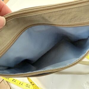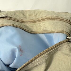 Discover the perfect blend of style and functionality with the Baggallini Tan Green Crossbody Bag. Blue inside.Ideal for everyday use, this bag features multiple compartments to keep your essentials organized. Elevate your accessory collection with this versatile piece. See images for measurements. Ink stain inside one pocket.