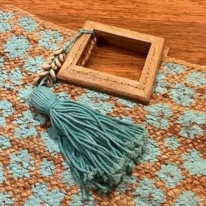 Twigs & Arrow Handmade Jute Hand Painted Oversized Boho Tote Bag w/ Wood Square Handle and Tassle with Shells.