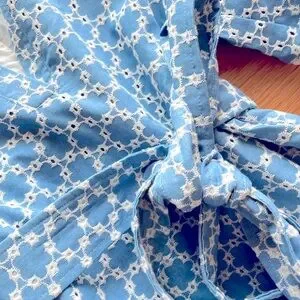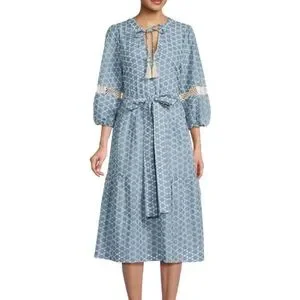 Elegant blue patterned dress with a stylish tie-front and delicate lace details. Perfect for any occasion.