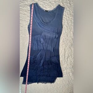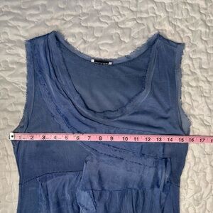 Unique and beautifully crafted, this Italian-made sleeveless dress features an artful patchwork of silk and viscose with raw edges, cascading tiers, and an asymmetrical hem. The deep dusty blue tone and floaty texture give it a romantic, deconstructed vibe — perfect for fans of lagenlook, cottagecore, boho chic, or Y2K avant-garde fashion.