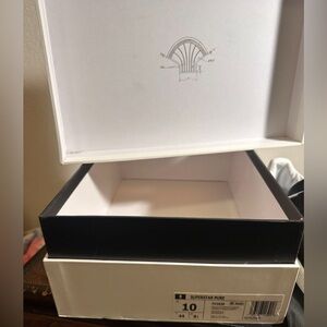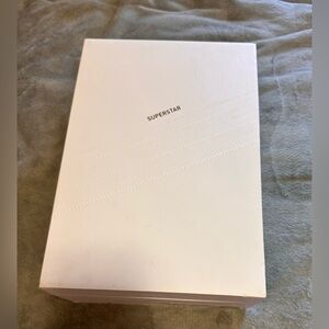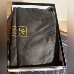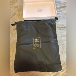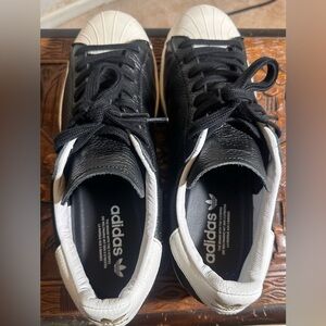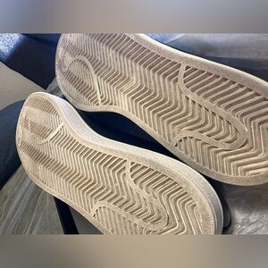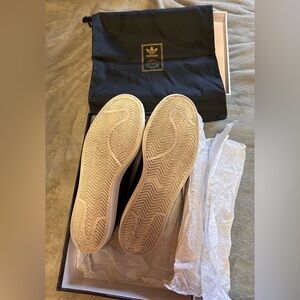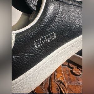 Immaculate condition, I've worn these sneakers exactly once. No scuffs, no creases, no sock lint on the inside. A true pair of worn once sneakers. Pebbled Italian leather upper, a molded leather sockliner and because these are Superstar 1s they have the thin leather tongue and original shell-toe design. These were sold with a black drawstring cloth bag with the gold Adidas Tre-foil tag stamped on the front and an all white, ridgid cardboard shoebox. This is truly a great pair of shoes along with the included extras.