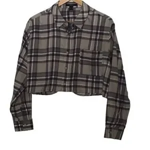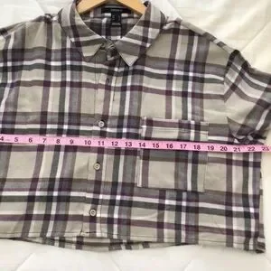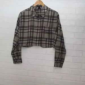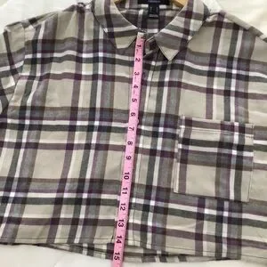 2/40$ FLANNEL plaid checkers Forever 21 oversize Crop blouse plaid beige neutral