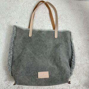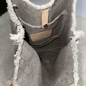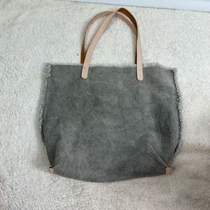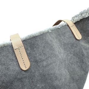 Washed gray canvas fringe tote with tan leather trim and double handles