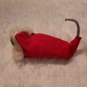 This vintage Annalee Christmas Mouse figurine is a charming addition to any holiday collection. The hand-painted felt doll is dressed in a red stocking with holly accents and is nestled in a cozy nest. The mouse is from the 1980s and was manufactured in the United States during that time period.