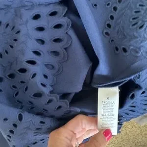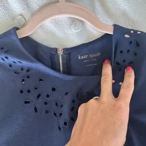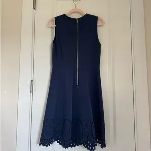 This elegant navy sleeveless dress features intricate cut-out detailing, perfect for any occasion. Its classic design offers a flattering fit, making it a versatile addition to your wardrobe.