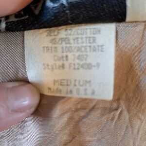 Vintage Facets by Mirrors Best women's size medium people Made in the USA a of cotton polyester and the trim is acetate style number F12400 - 9 In great condition no rips stains or holes has 3 large buttons in the front and a tie back back adjustable band in the back Size medium see pictures for lay flat measurements Armpit armpit 18" and shoulder to him 19" Wearable art artsy Great for teachers Or just a casual vest