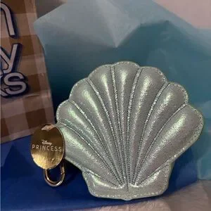 Shimmering shell-shaped coin purse with a Disney Princess tag. Perfect for small essentials.