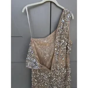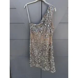 Mac Duggal 10977 Nude/beige One Shoulder Asymmetric Sheer Hand Beaded Mini Dress Sz 12