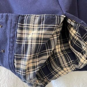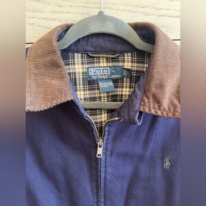 This Polo by Ralph Lauren jacket combines a sleek blue body with a contrasting corduroy brown collar, with plaid flannel interior, offering a stylish and versatile look. Crafted from durable materials, it features a full-length zipper and buttoned cuffs for a comfortable fit. Perfect for casual occasions, this medium weight jacket adds a modern touch to classic workwear style.
