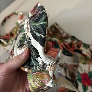 Embrace summer with this vibrant tropical print bikini set. Perfect for beach days, this swimwear features a colorful design that stands out. Good condition, flaws shown in photos- underwire poking through just a tad and some frayed seams and small stain on inner cup (cannot tell when wearing) but can be adjusted back down & easily fixed. Price reflects.
