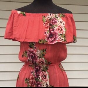 stunning floral off-shoulder maxi dress. Perfect for any occasion, this dress features a beautiful adorned with vibrant floral patterns. Alike the model , small size maxi dress.
