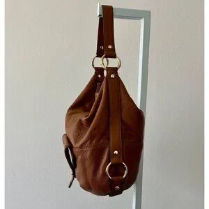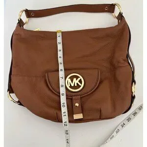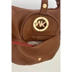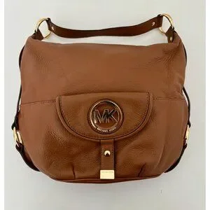 Features/Accents: Micheal Kors Cognac Brown Leather Bag, Logo Gold Hardware MK Bag, MK Brown Slouchy Hobo Shoulder Bag, Inner & Outer Pockets, Soft Leather, Top Zipper Closure