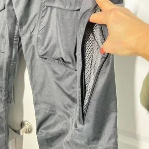 Super well made, tons of pockets, side and interior vents, lined, Velcro waist adjustable.