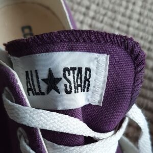 Stylish Converse All Star sneakers in a vibrant purple. Features classic white laces and toe cap. This classic never goes out of style. Unisex sizing women's 9 or men's 7. Very good condition with slight discoloration on left shoe (see closeup photo).