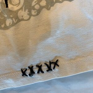 This awesome pre-owned Rebel Spirit Tank top is 100% cotton. There are no holes, stains or tears. However, the thread in two of the black "x's" at the bottom hem is coming undone. One is on the back and one is on the front. Also, a grommet has a bit of fabric coming loose. Please see photos and/or item specifics for details about these flaws as well as more information.