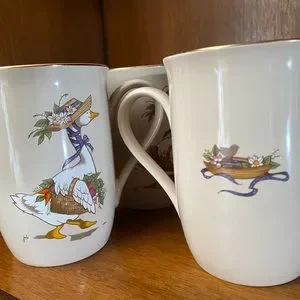 Set of four vintage Otagiri Japan mugs with adorable goose print. Label on bottom has Otagiri Japan signature and the print is from Gibson Greeting Card Inc. Rim is gilded gold. Perfect condition, no fading, scratches, or chips.