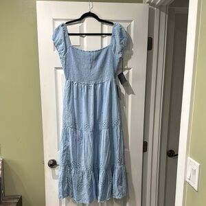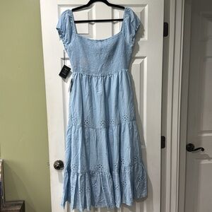 Very pretty women’s midi dress size L. It’s new with tags but has couple flaws (see last two pictures).