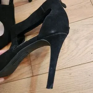 Pre-loved Jones New York Christie Heels. Size 9 with stretchy ankle straps and zipper at the back of the heels. Black suede/leather. 4 inch heels. Pointed toes. Insoles have some squish to them. Flaws pictured.