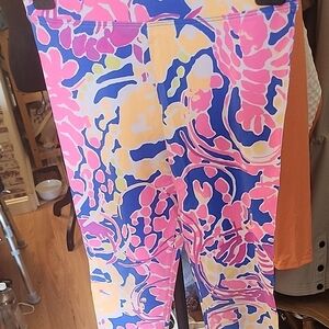 Bright and colorful leggings with a pink, blue, and yellow abstract pattern. Perfect for adding a pop of color to your workout or casual outfit.