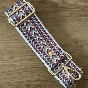 Vibrant zigzag pattern strap with crimson, blue, tan colors.