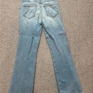 These MOTHER jeans feature a stylish flare and wide leg design in a classic blue shade. The distressed detailing adds a vintage touch, making them perfect for casual outings. Crafted for comfort and style, they offer a relaxed fit with a modern edge.