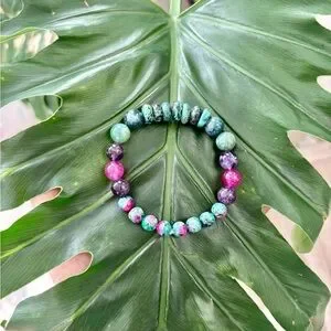 This handmade stretch bracelet is thoughtfully crafted with Turquoise, Moss Agate, Chevron Amethyst, and Dyed Jade—a vibrant and grounding combination that supports clarity, balance, and spiritual connection.