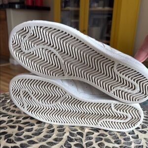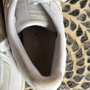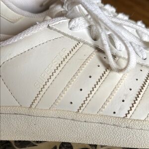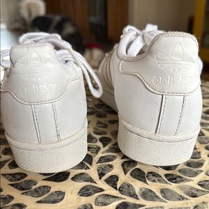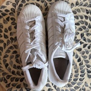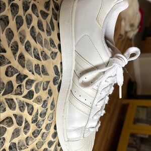 Adidas Superstar Triple White. Mens size 7. Used, gently worn condition. Cleaned. Right heel has some discoloration on liner. See photos for detail. Sold as is.