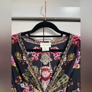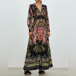 Elegant maxi dress with a V-neckline. Features vibrant floral patterns and sparkles on a black base.