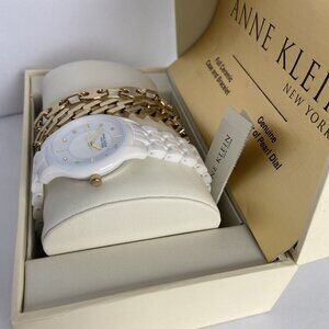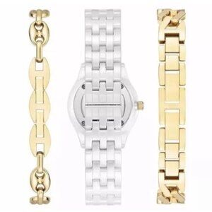 Anne Klein Ladies 12/7740WTST White Ceramic Watch w/ 2- Gold Tone SS Bracelets