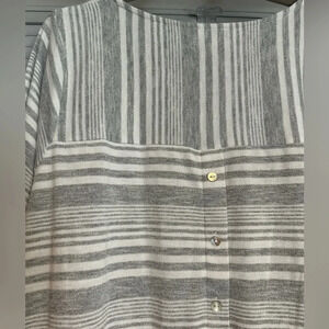 Grey and white striped shirt with buttoned vent in back of shirt H-20