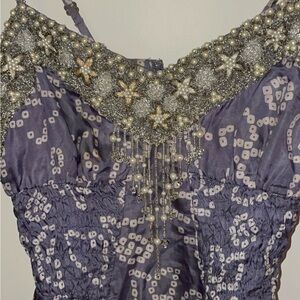 Elegant purple dress with intricate embellishments. Features spaghetti straps and a detailed neckline. 100 percent silk. The straps are adjustable