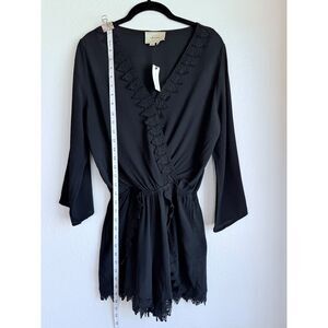 Elegant romper in classic black featuring a wrap style v-neck neckline, 3/4 bell sleeves, and an elastic waist. Lace trim gives it a boho chic touch.