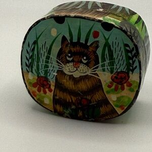Charming hand-painted trinket box featuring a cat design. Enamel or lacquer on wood ? Vibrant colors add a playful touch. Tiny box. Some wear on box. See pics. Message me with any questions.