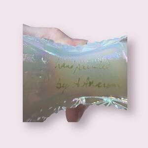 A great piece for anyone collections or just starting. It is white iridescent with inlayed daisies and gold dots. This piece is hand painted and signed by A. Arcrom.(I think, it is hard to read.)