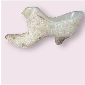 Vtg Fenton Iridescent Ladies Daisy & Gold Button Cat Face Shoe