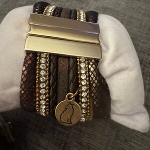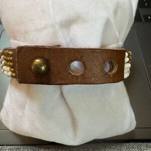 Stylish gold and brown beaded leather bracelets. Perfect for any occasion. BOHO WESTERN GLAM. The white and gold beaded bracelets is 8 in but adjusts to 7 “. The multi strand bracelet has a magnetic slip closure and is 7.5 “ Gently worn and loved before, softened to perfection…. Definitely unique and beautifully made.