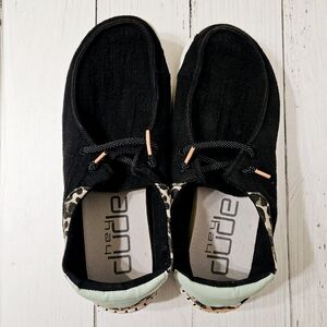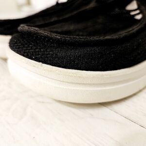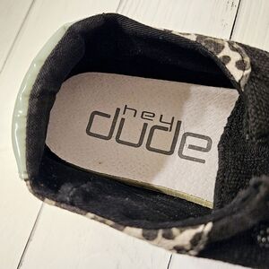 👟 Hey Dude Wendy Rise jungle funk black women's size 8 slip-on shoes for SALE 📣 Pre-owned. Moderately used. Overall good condition. Cleaned and wiped 🧼 Some residual marks and dirt present from wear (pictured 📸). Features a canvas upper with an extra cushioned leather insole. Smooth, lightweight, and flexible 💪 No tags or original box. These sneakers were storage unit stored 💸 $30 📦 All sales are final. No refunds or exchanges.