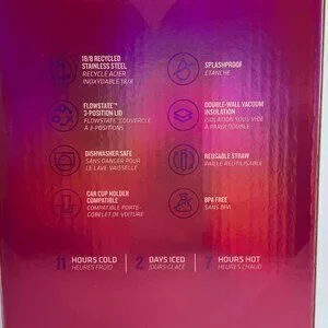 Glossy berry color (deep purple-pink) with pops of iridescent metallics and berry-tinted lid and straw. Beautiful glossy iridescent box and heart-shaped card with envelope make this perfect for gifting. The versatile FlowState 3-position lid has three sip settings: one for the reusable straw, one without straw, and one to close the silicone cover.
