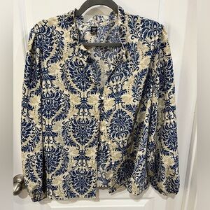 This stylish blouse from SHEIN showcases a bold blue and cream pattern with a notched collar and buttoned front. The intricate medallion design adds a touch of elegance, making it a perfect choice for a sophisticated look.