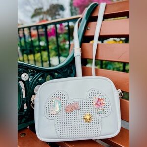 Brand New Stylish and versatile white crossbody bag featuring Disney Mickey. Detachable Strap, gold hardware, and comes with inside pocket. Perfect for Pin Trading with holes to attach them! (Sold Out Item)
