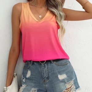 Brighten your wardrobe with this stunning gradient top. Featuring a vibrant pink to orange design, this top is perfect for any casual outing. The button detail adds a touch of elegance.