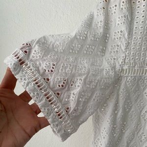 Club Monaco Colinee Eyelet Top Size Small in great condition. Embroidered cotton eyelet mixed with delicate ladder-stitch insets. Back keyhole with button-and-loop closure - Jewel neck - Short sleeves - Curved hem - Semi-sheer - 100% cotton - Machine wash, tumble dry - Imported -