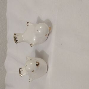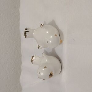 white porcelain birds salt and pepper shakers they have gold beak gold eyes and gold wing tips with stoppers underneath bottom no cracks or chips. they measure 3 in long and 2 in tall.