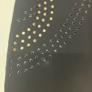 Cynthia Rowley Black Silk Studded Sheath Dress Size 6. Stunning silk dress with gold and black embellished stud details. It is fully lined with a back zipper. Shoulder to hem measures approximately 36.5. There is a place at the bottom front left on the dress that looks like maybe some glue transfer from one of the studs? Also a very faint whitish place on the back of the dress. All of these barely noticeable when the dress is on. Please see all photos for details and feel free to ask questions!
