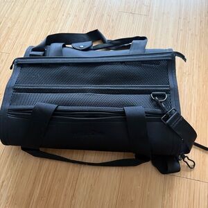 The stylish and comfortable home-away-from-home that your dog deserves! This airline-approved dog carrier features breathable mesh walls, a shoulder strap that doubles as a leash, and an interior cushion that folds out to become a travel dog bed.