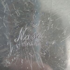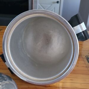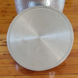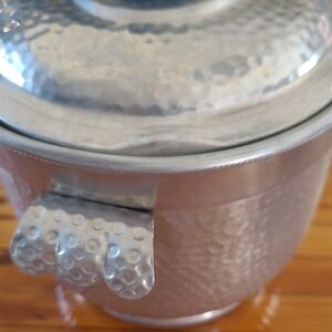 Elegant hammered silver ice bucket set featuring black handles. This one is made by Puralum a Mid Century Modern. It does have scratches on but no dents. The next is a Nasco made in Italy. It does have dents and scratches but still keeps ice cold. You get both for one price. Please look at pictures.